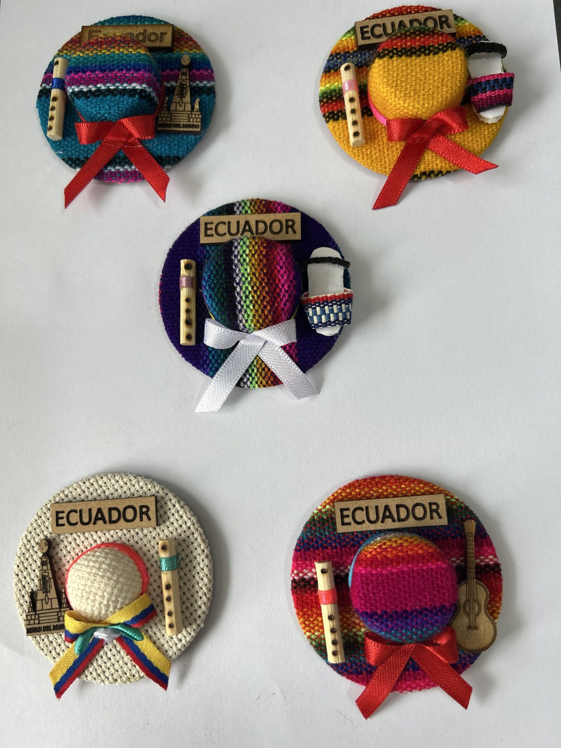 Magnetos de sombrero, elaborado en tela manta y con alegoría de Ecuador.