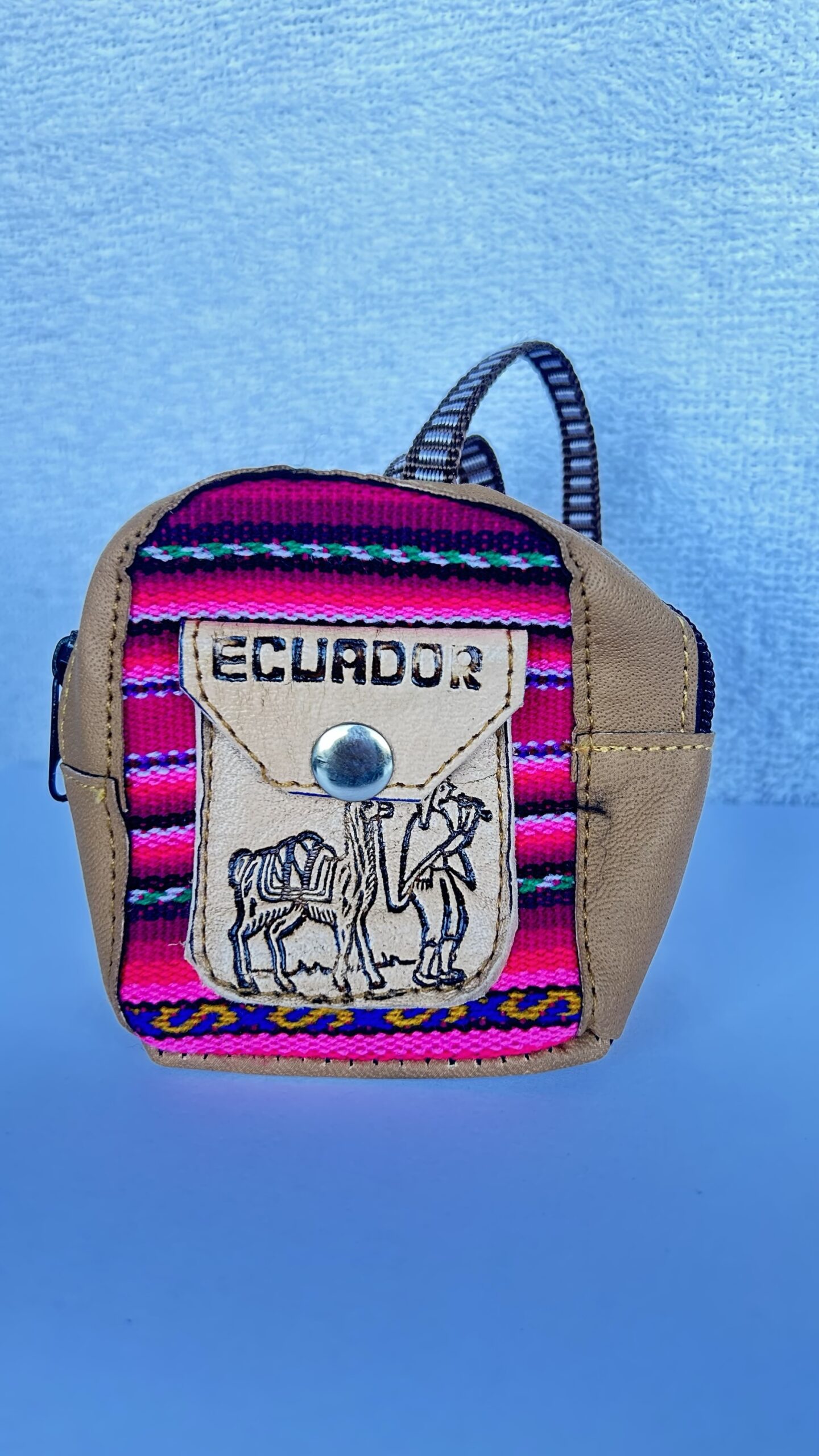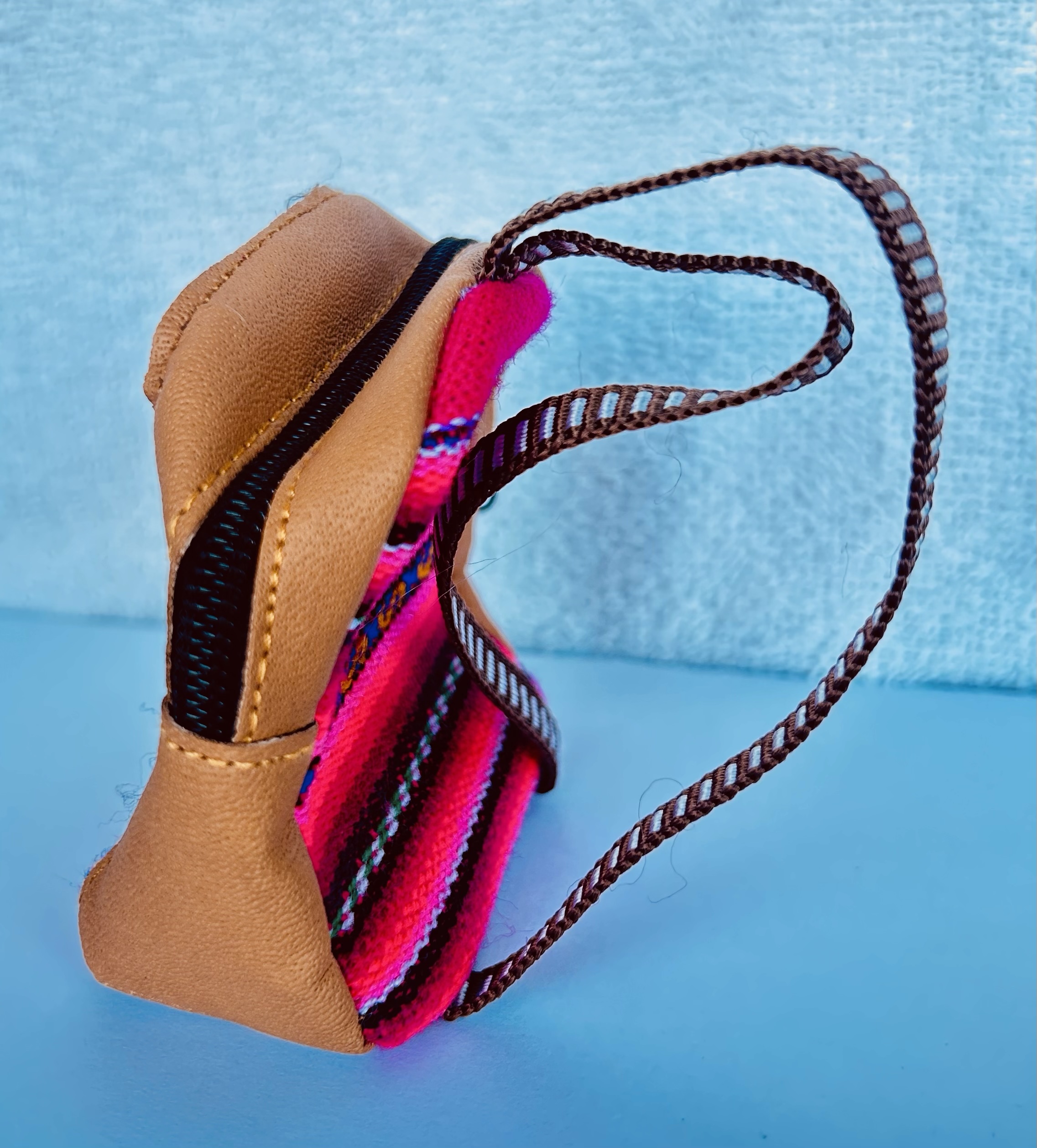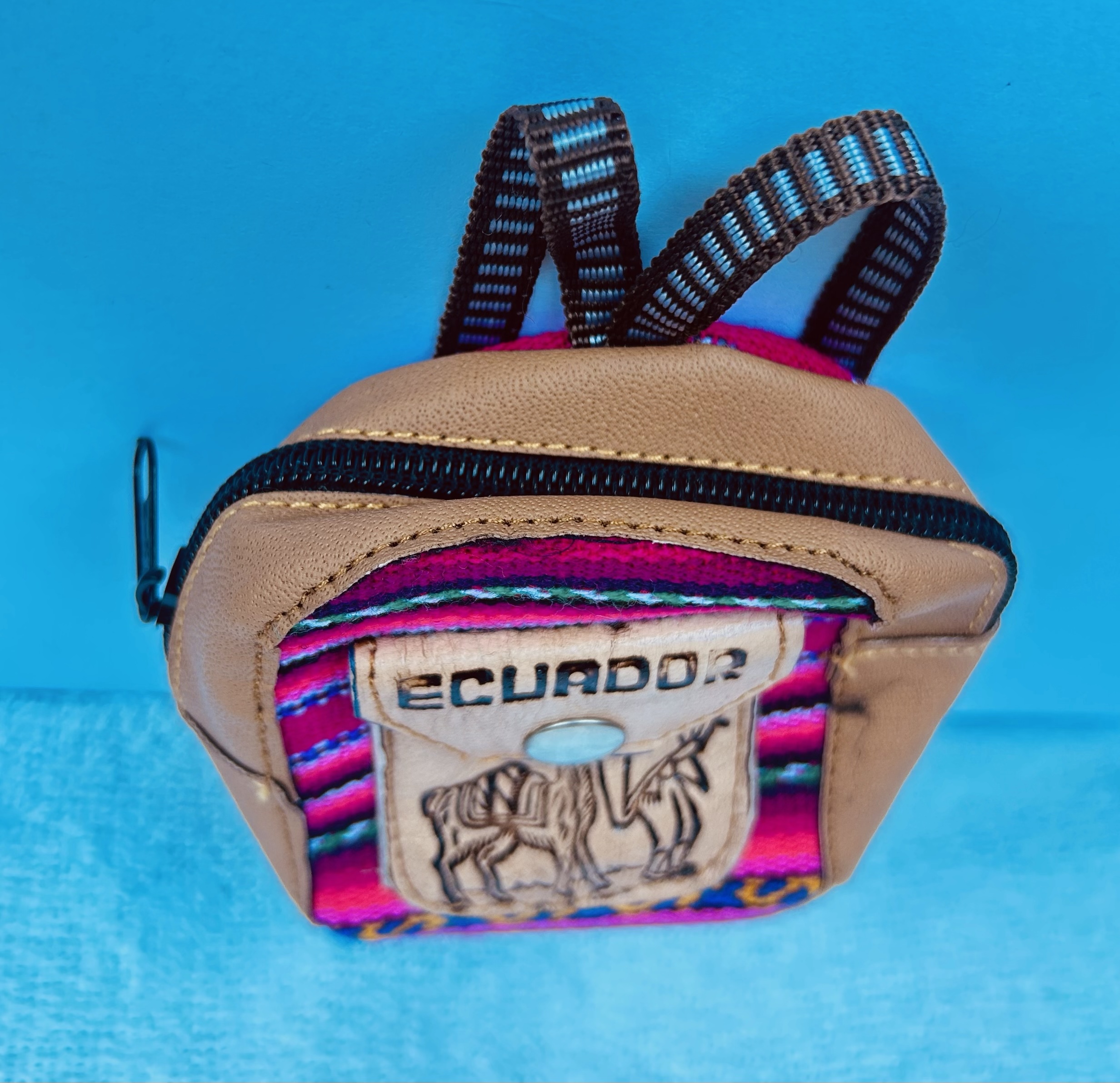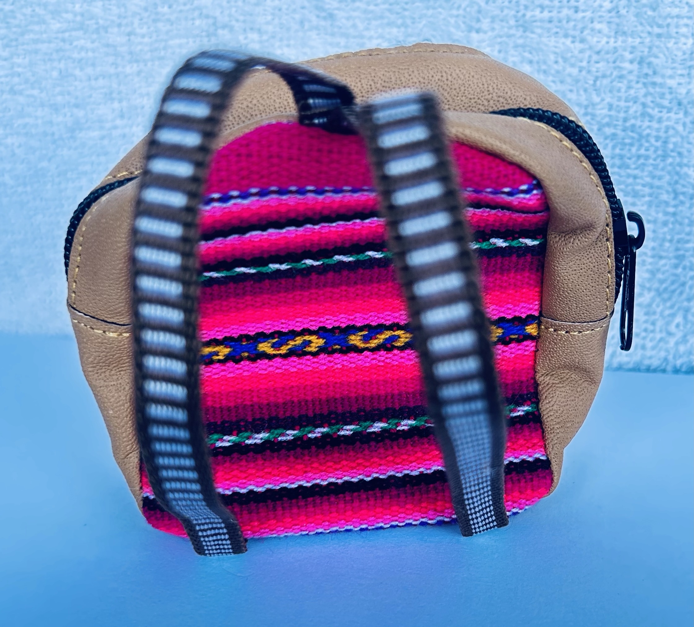Monedero en forma de mochila, elaborado en cuero cuero y manta de colores