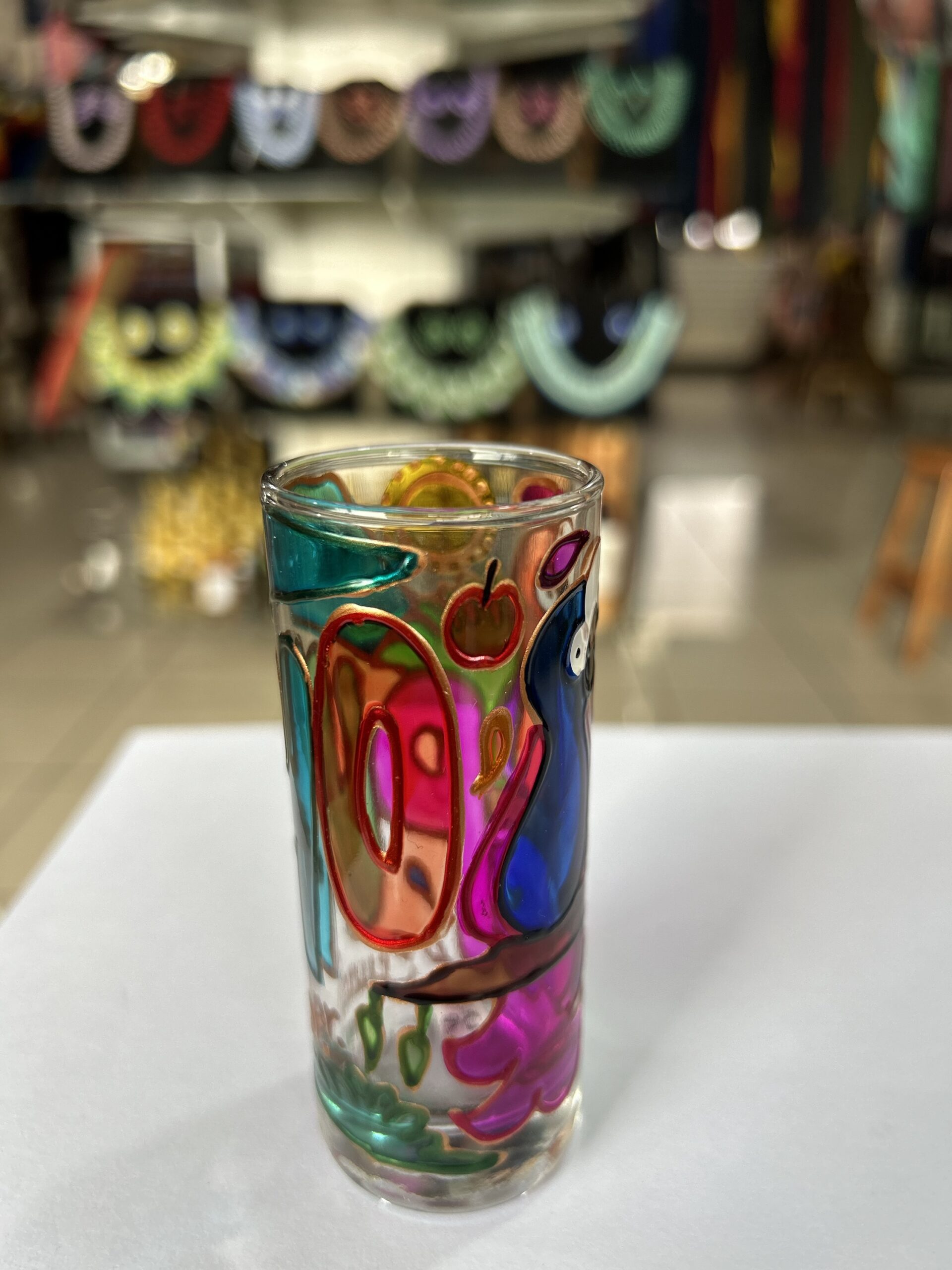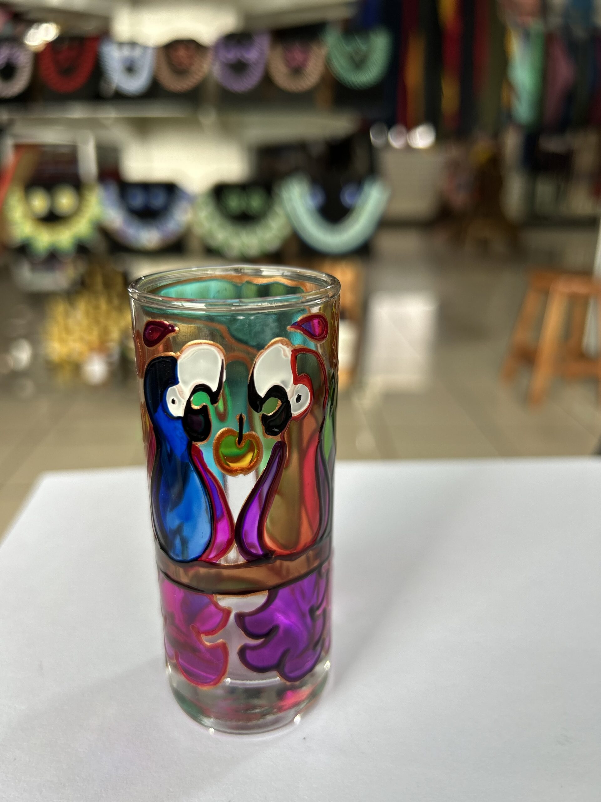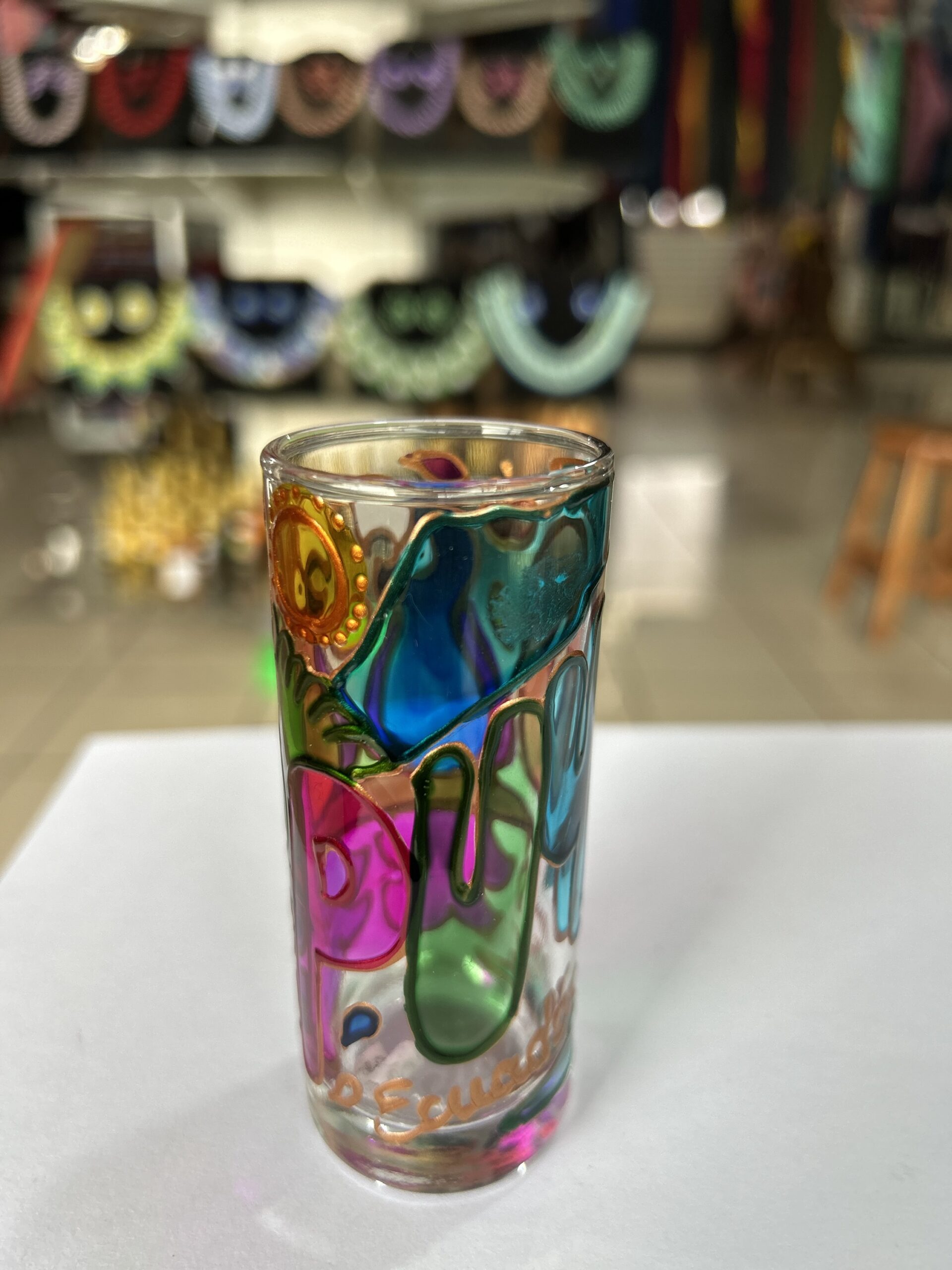 Vaso tequilero pintado en alto relieve.